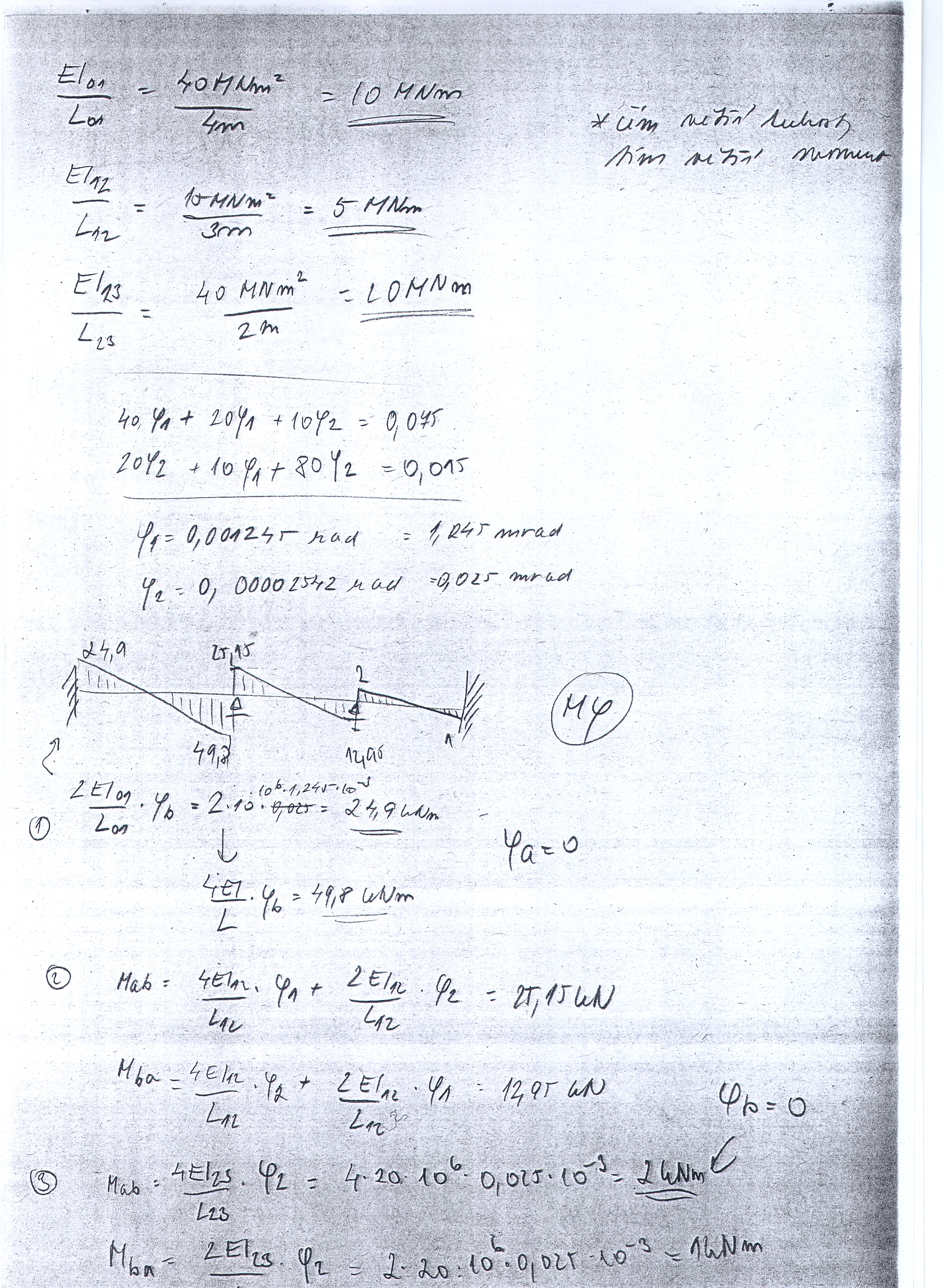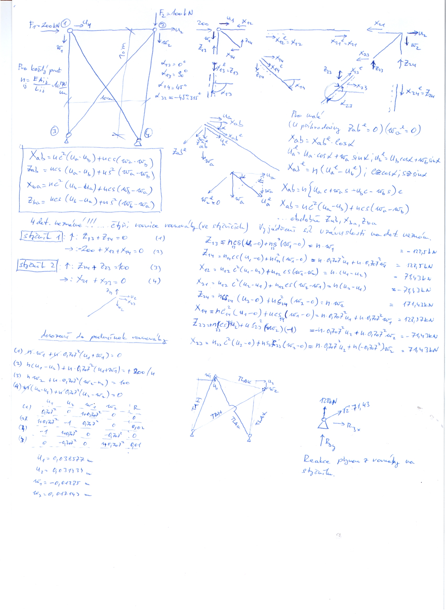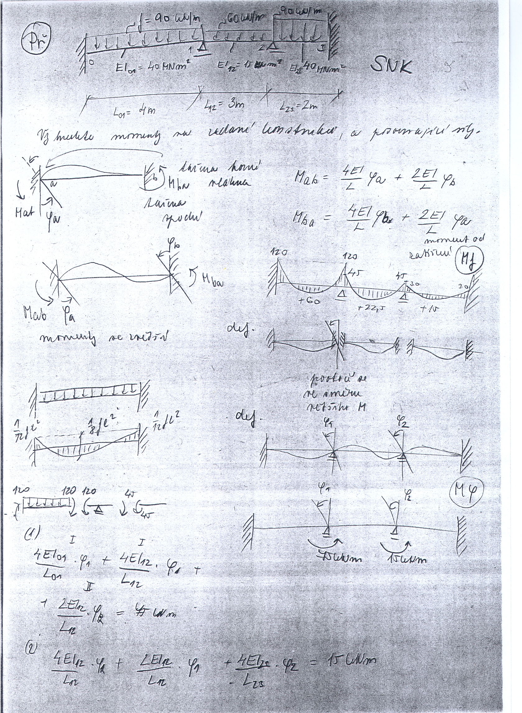 Výpočet posunů na nosníku: integrací ohybové čáry z momentového průběhu nebo rozdělení posunu na posun od deformace styčníku a posun od vlivu zatížení, kde pro celkový posun samozřejmě platí superpozice. Pokud někomu jeden ze způsobů nevychází, doporučuji ověřit výpočet druhým způsobem. Pokud Vám vyjdou obě varianty stejně informujte mne a dáme to nějak do hromady. Je možné, že tam budete mít například zaokrouhlovací chyb atp.